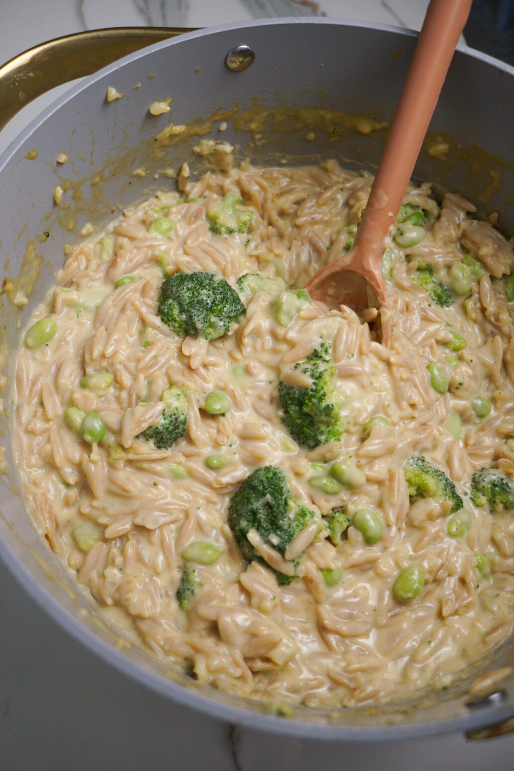 - Once orzo has absorbed most of the liquid and is al dente, stir in the cashew mixture, edamame, broccoli, and cauliflower rice. Continue to simmer until veggies have defrosted, most of the liquid is absorbed, and you’re left with a creamy consistency (about 5-7 minutes).