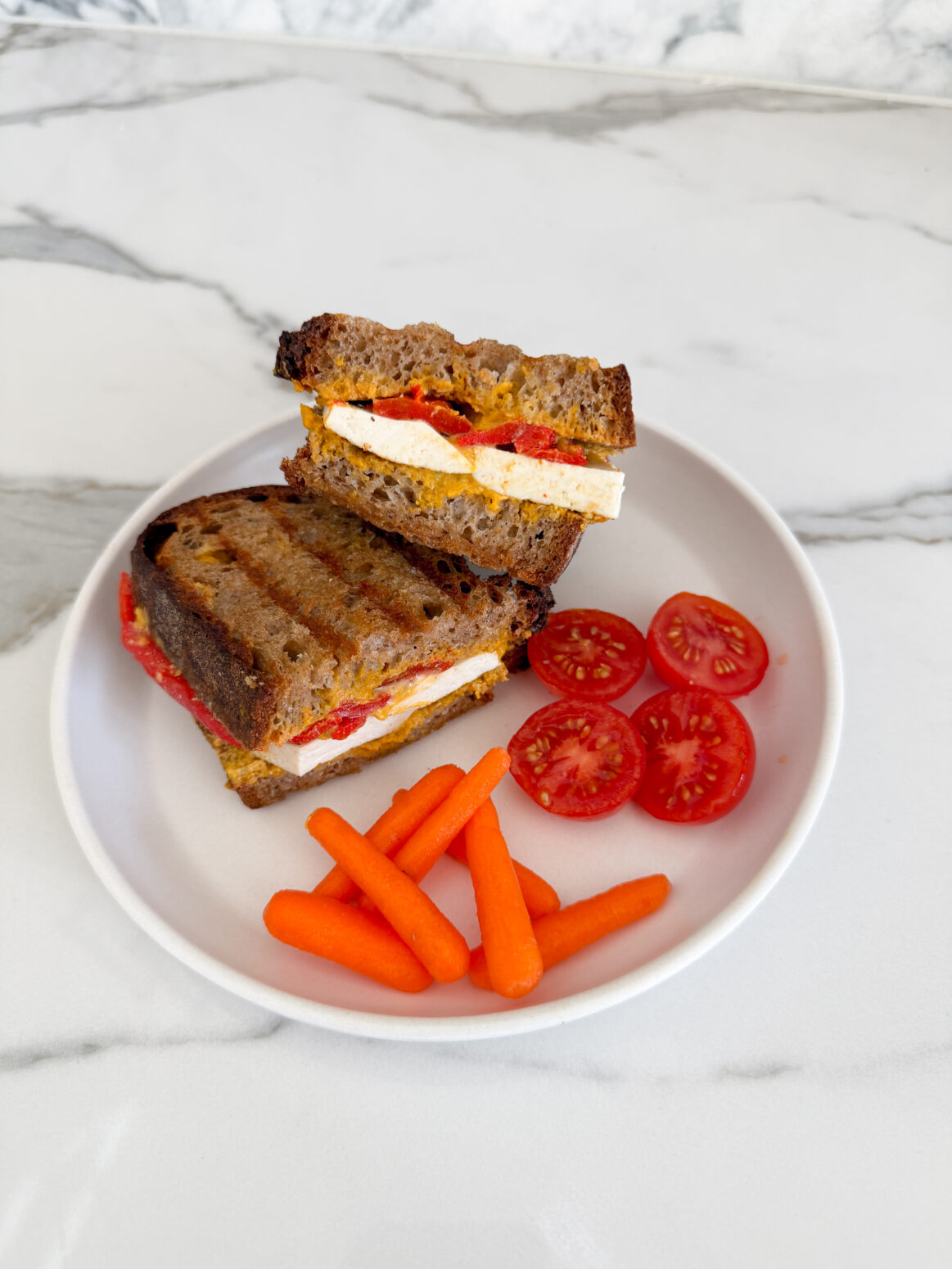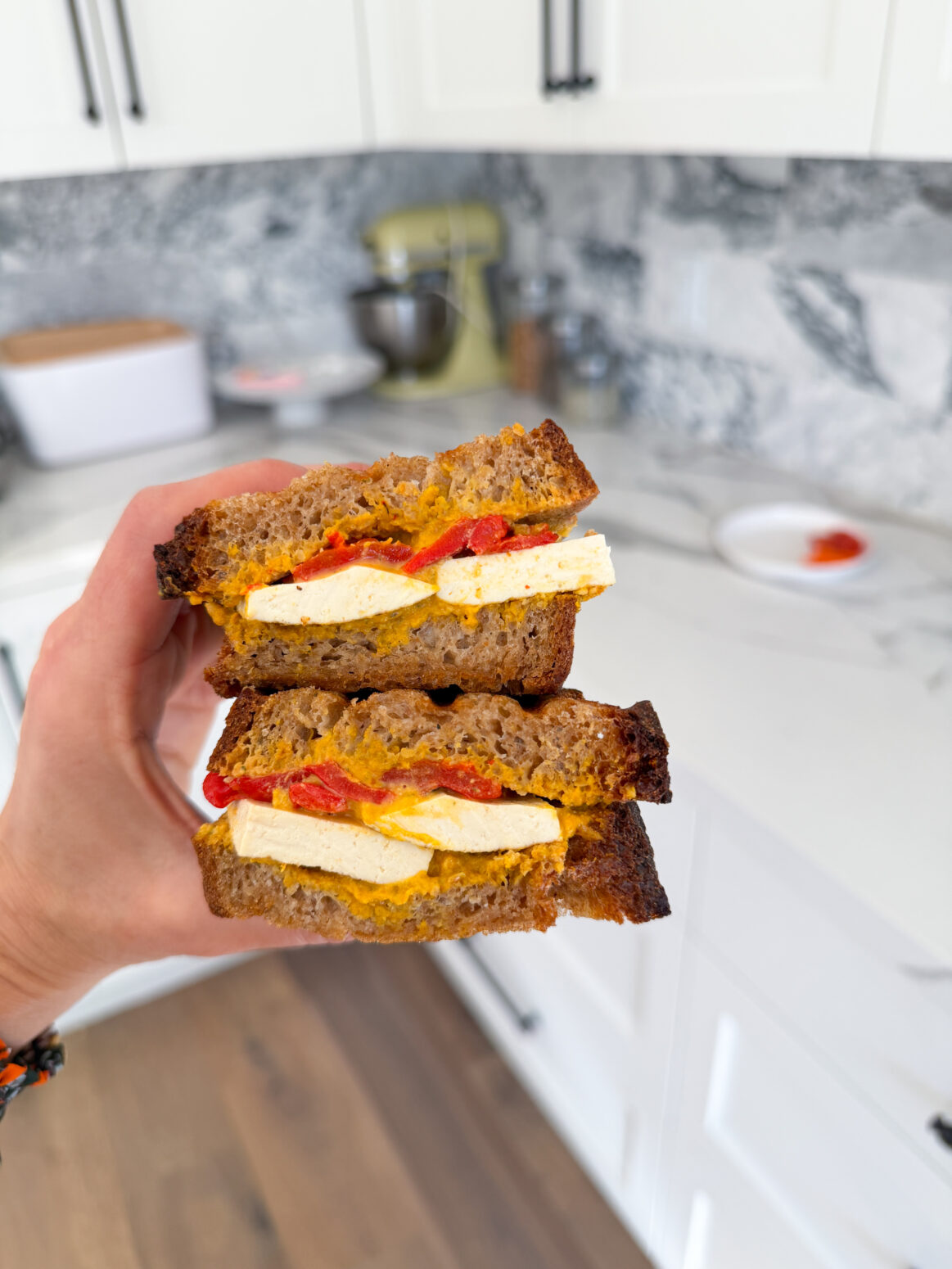 Spread pumpkin seed spread (mostly pumpkin purée + pepitas + nutritional yeast) on whole-grain bread. Layer with pre-grilled tofu, roasted red peppers, and a sprinkle of plant-based mozzarella if you like things extra melty. Toast until golden and crisp.