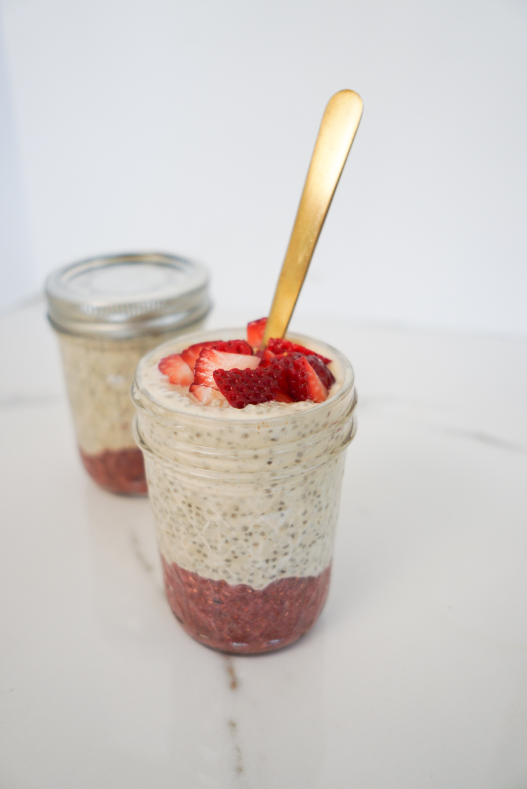 - Add two tablespoons chia jam to a mason jar, then top with half of the chia pudding. Repeat.