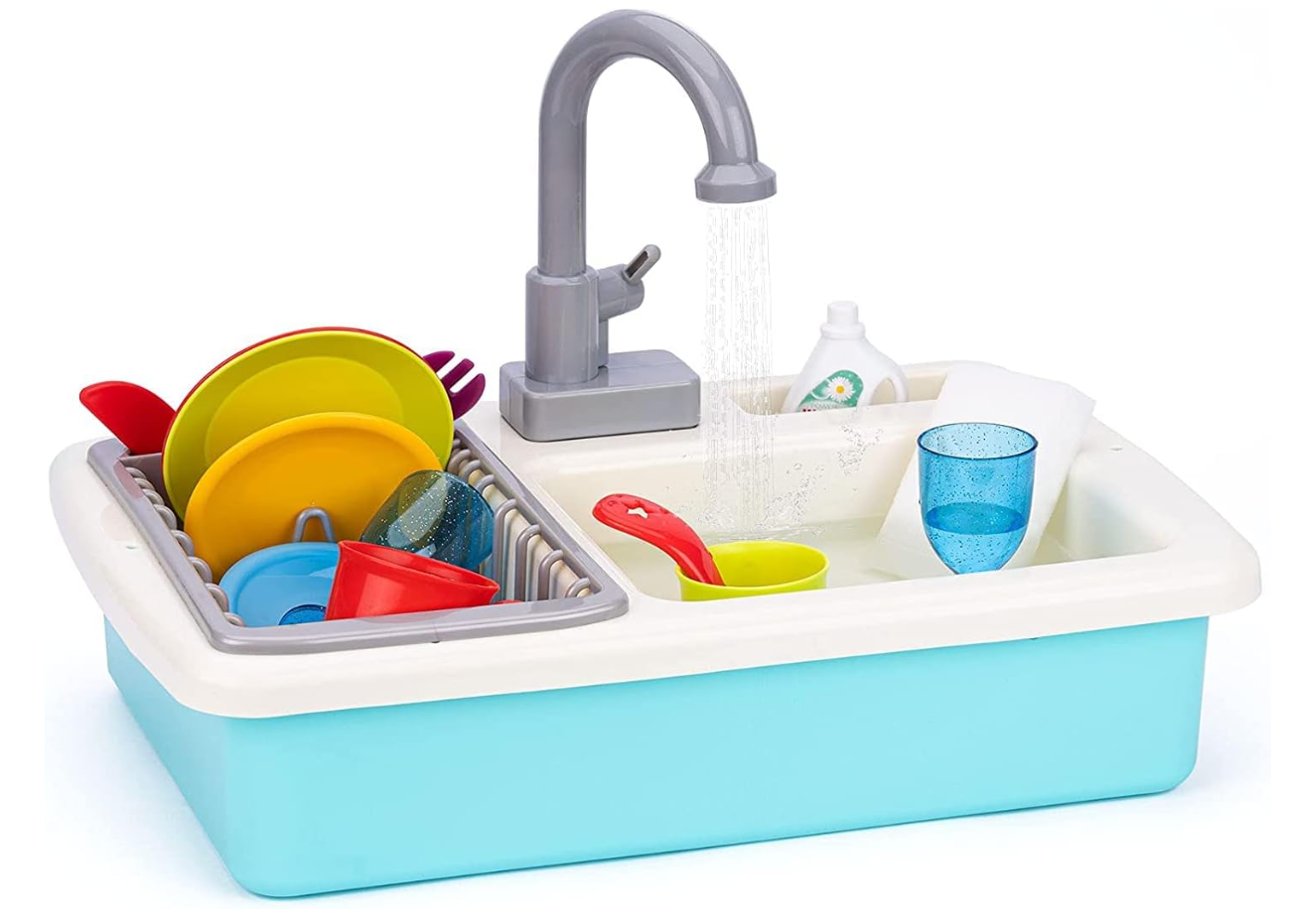 Mini Kitchen Sink (with real running water): Yes, with real running water! Your kids can do the dishes alongside you. We have this in our play kitchen and our kids love doing the dishes as they serve food in their restaurant.