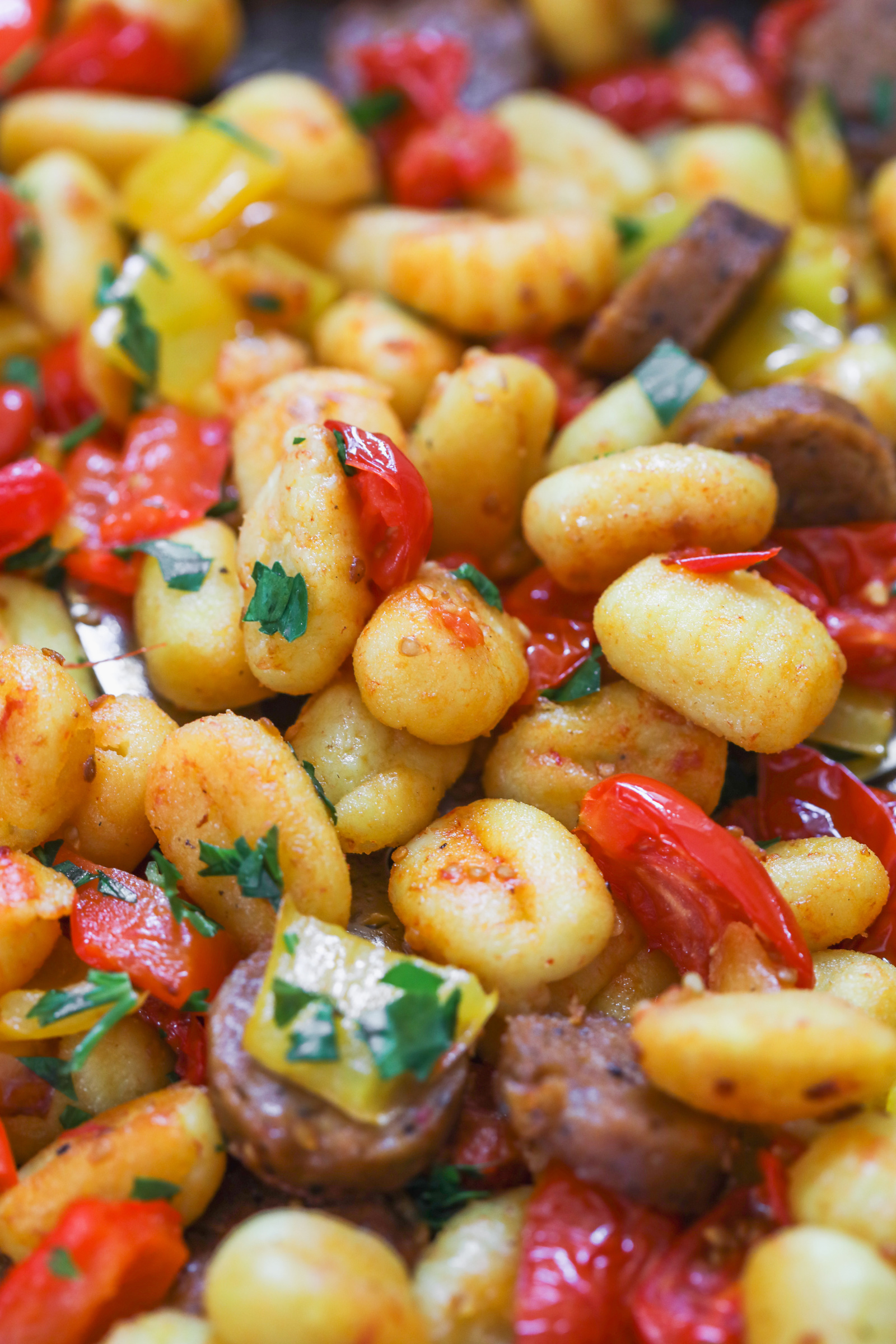 The easiest dinner for weeknight meals! Slice the peppers, slice the sausage, then toss with packaged gnocchi, olive oil and seasonings.