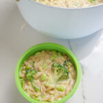 Once orzo has absorbed most of the liquid and is al dente, stir in the cashew mixture, edamame, broccoli, and cauliflower rice. Continue to simmer until veggies have defrosted, most of the liquid is absorbed, and you’re left with a creamy consistency (about 5-7 minutes).